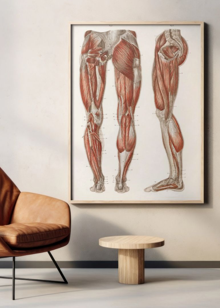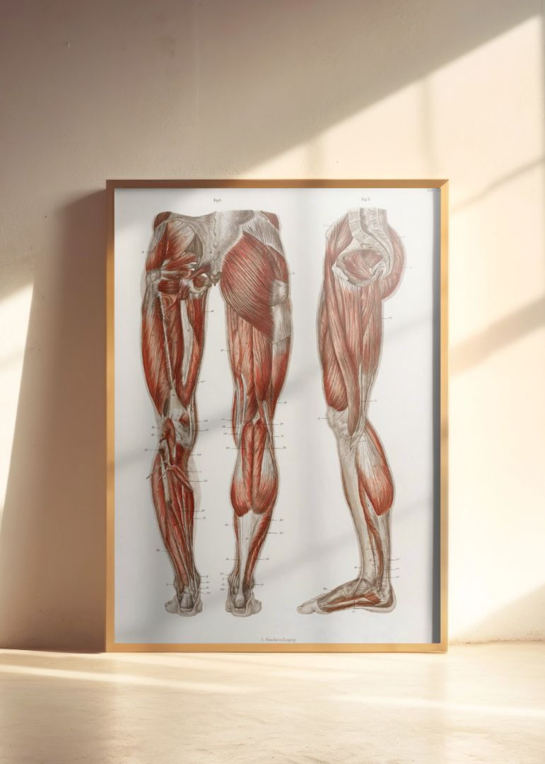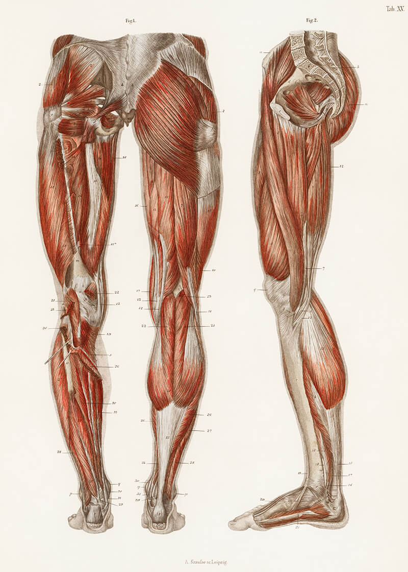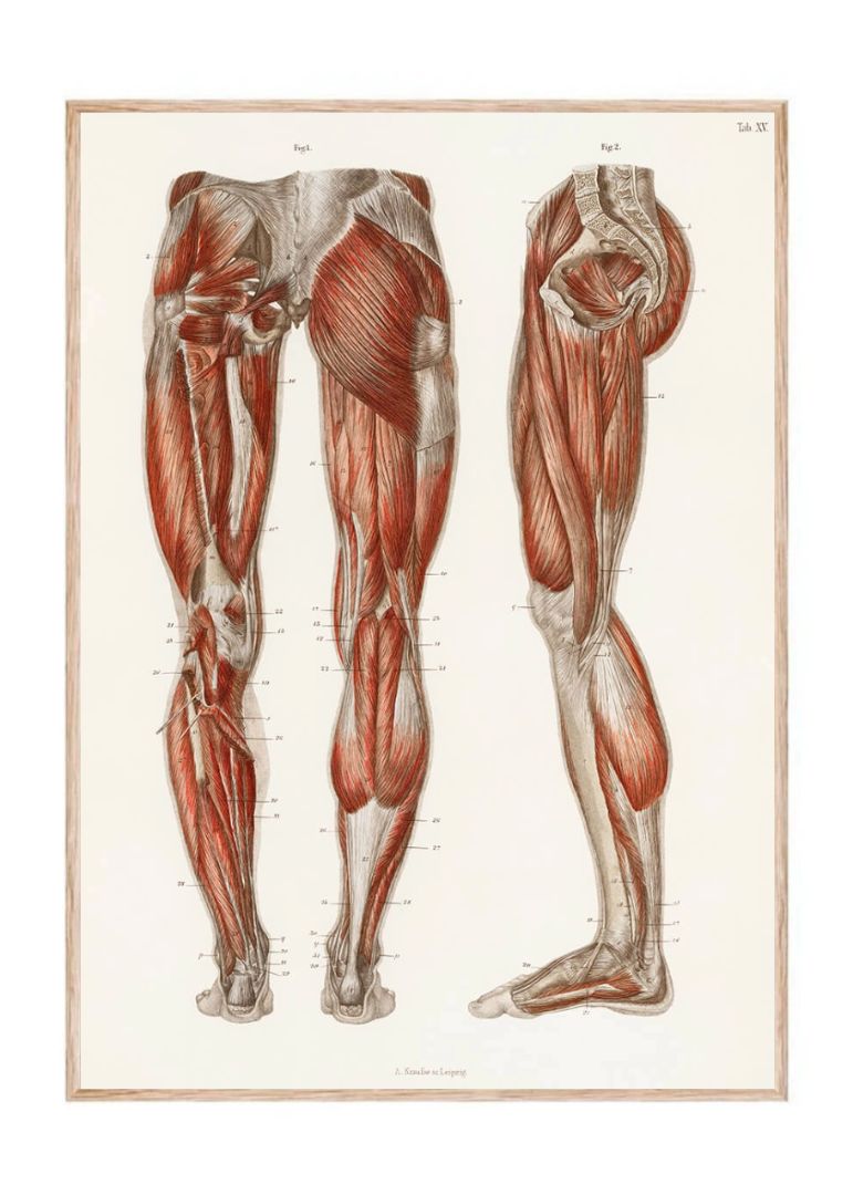 Denne detaljerede illustration fra 1864 er en fascinerende visning af muskulaturen i menneskets ben og fødder. Skabt af den anerkendte anatom Carl Ernst Bock, fremviser værket en minutiøs opdeling af muskler, sener og strukturer, der danner grundlaget for bevægelse og stabilitet i underkroppen.