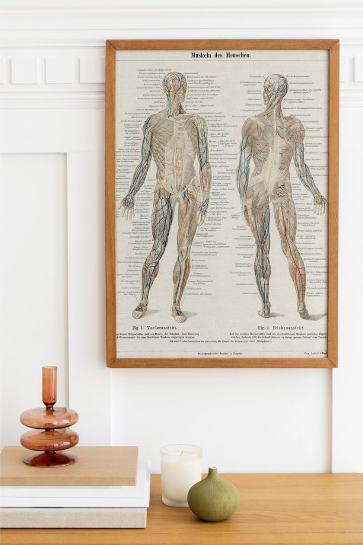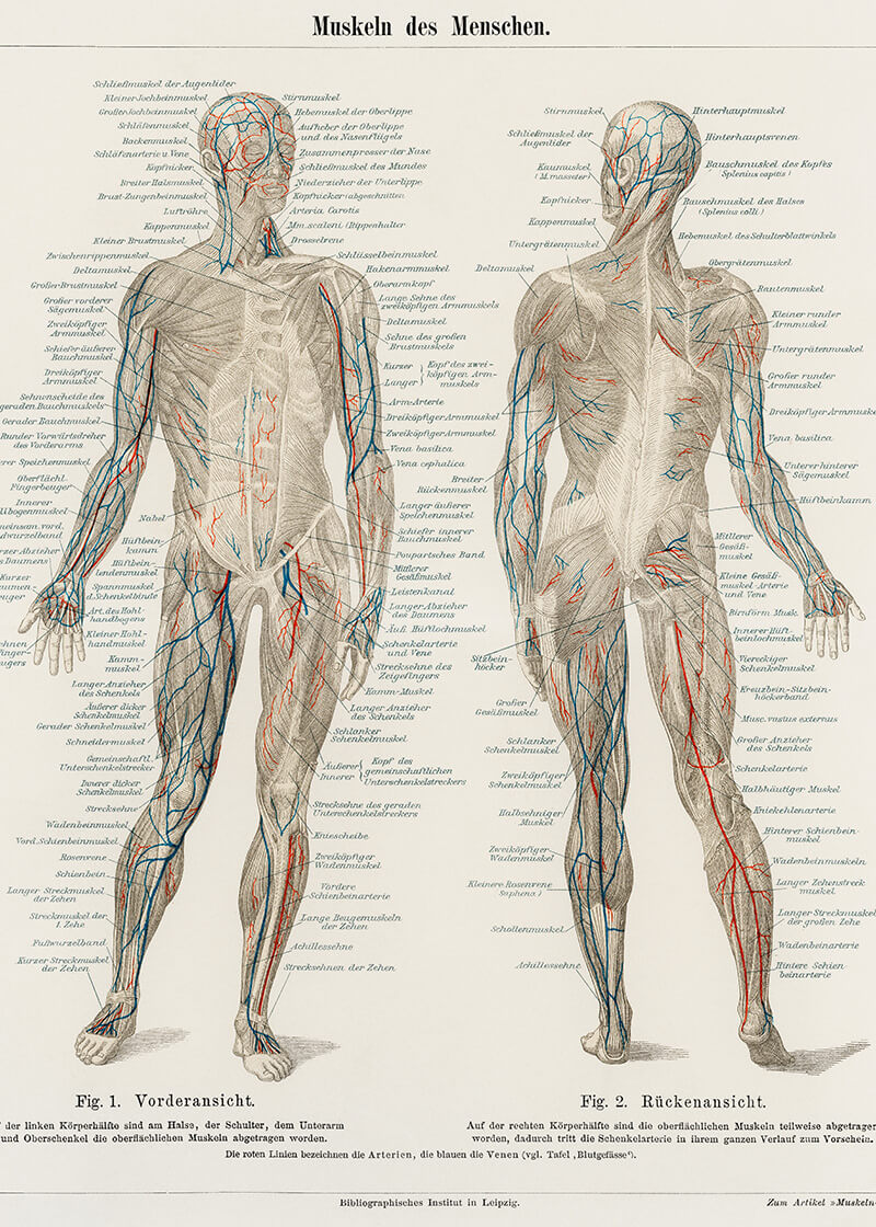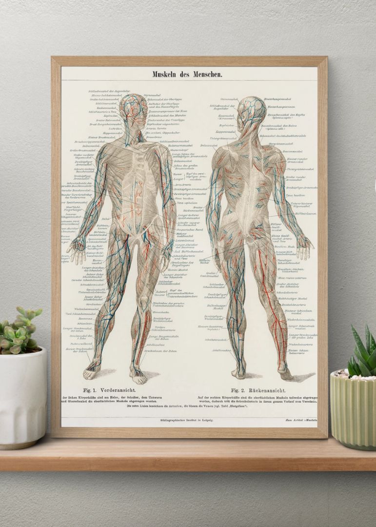 Fra Meyers Konversations Lexikon i 1894 præsenterer denne litografi en omfattende visning af kroppens muskelsystem set fra både front og ryg. Værket kombinerer kunstnerisk finesse med medicinsk nøjagtighed, hvilket gør det til en imponerende visuel fremstilling af kroppens kompleksitet.