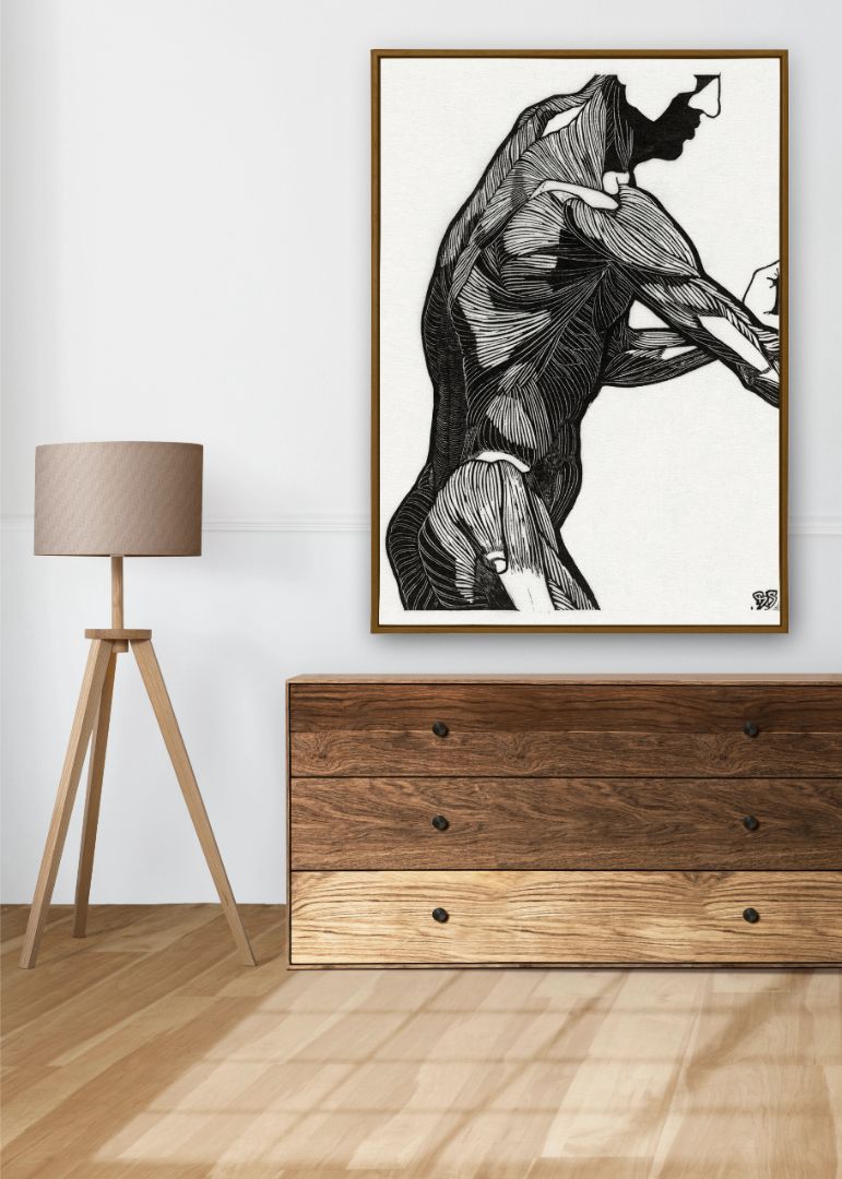 Dette kunstværk fra begyndelsen af 1900-tallet er en skildring af kroppens muskler, udført med en grafisk og elegant præcision. Det minimalistiske design fremhæver kroppens anatomi, hvilket gør det til et kunstnerisk mesterværk, der passer perfekt i moderne indretning. For elskere af grafisk design, medicinsk kunst eller dem, der søger at bringe noget unikt ind i deres hjem, er denne plakat et ideelt valg.