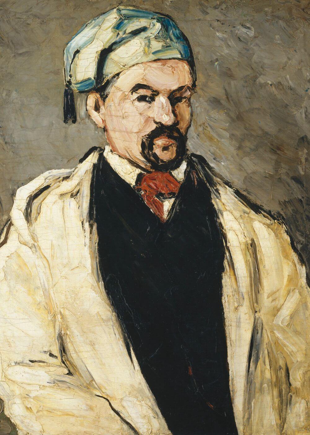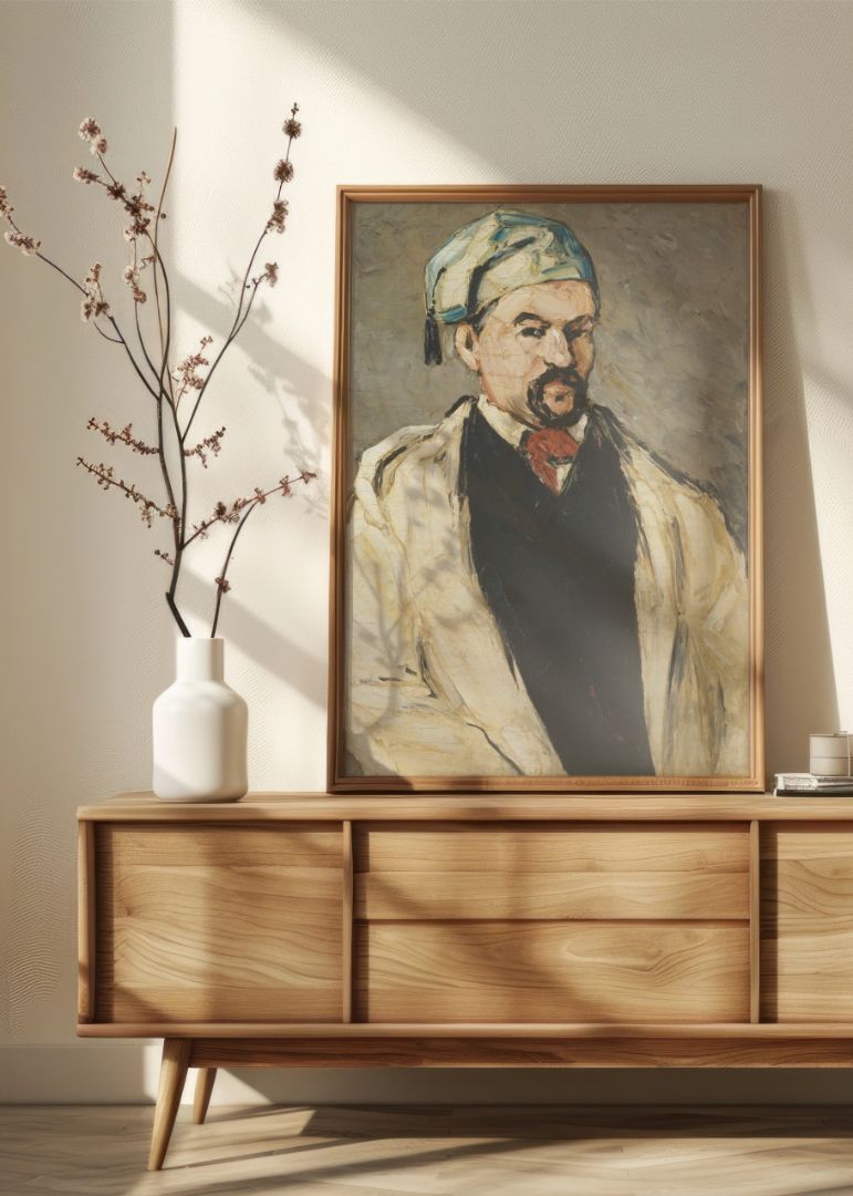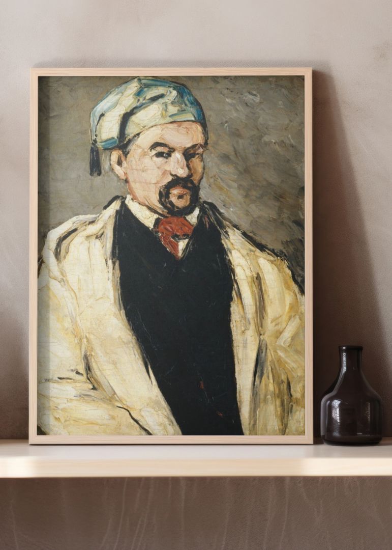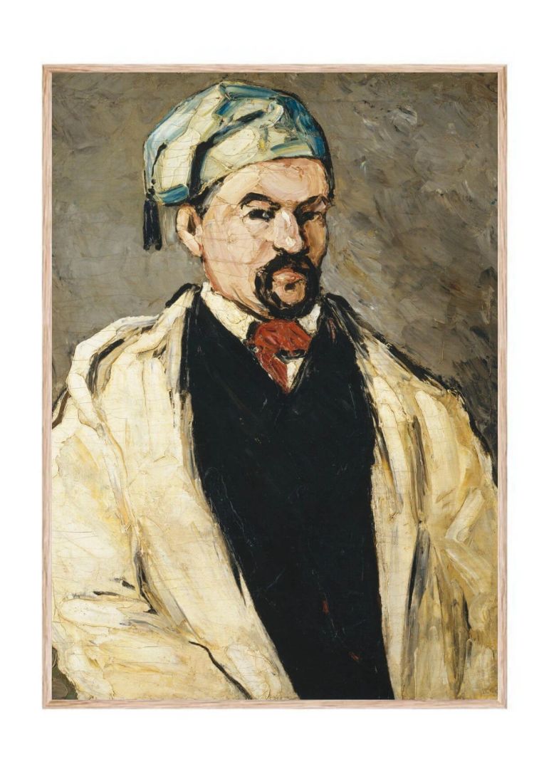 Denne plakat præsenterer et dramatiske portræt, hvor de kraftige penselstrøg og den rige farvepalette skaber en fornemmelse af liv og dybde. Den mørke baggrund får mandens ansigt og tøj til at træde frem med en nærmest skulpturel kvalitet, mens de lyse nuancer i frakken tilføjer kontrast og dynamik. Hans skarpe blik og den karakteristiske hue giver motivet et mystisk og næsten teatralsk udtryk.