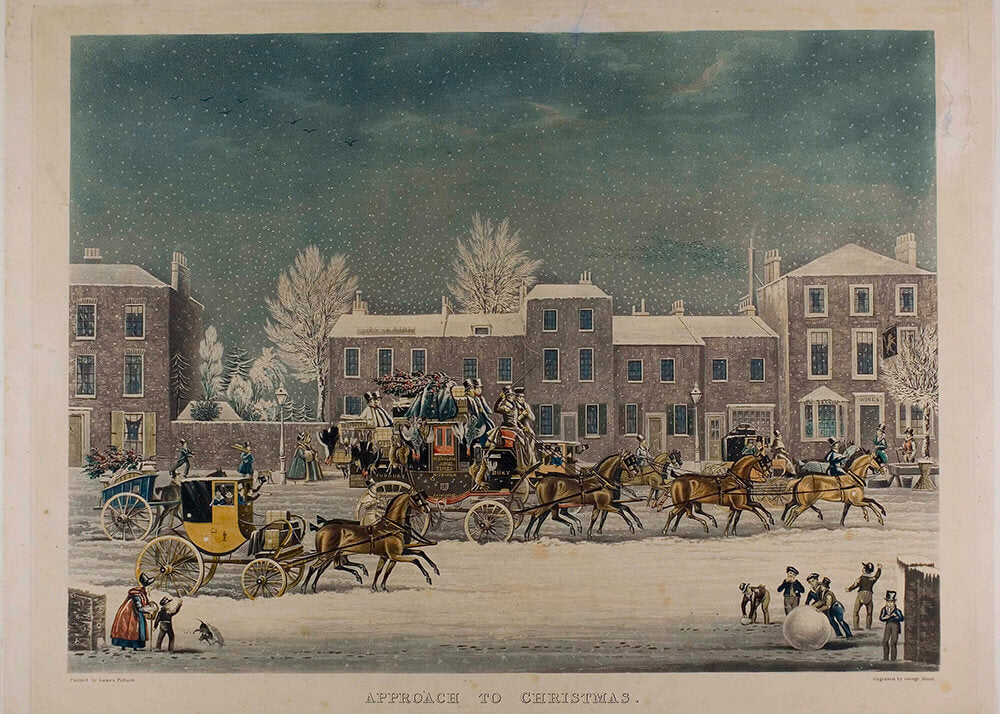 Denne scene fra George Hunt skildrer en travl vinterdag, hvor vogne og heste bringer gaver og glade folk frem mod højtiden. Husene og den sneklædte by skaber en nostalgisk følelse af juleforberedelser i en svunden tid. Perfekt til at bringe gammeldags charme og hygge til juleindretningen i dit hjem.