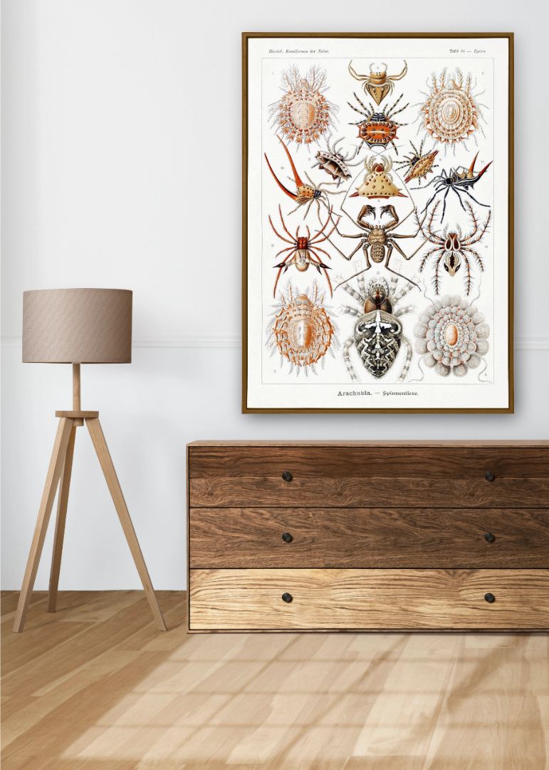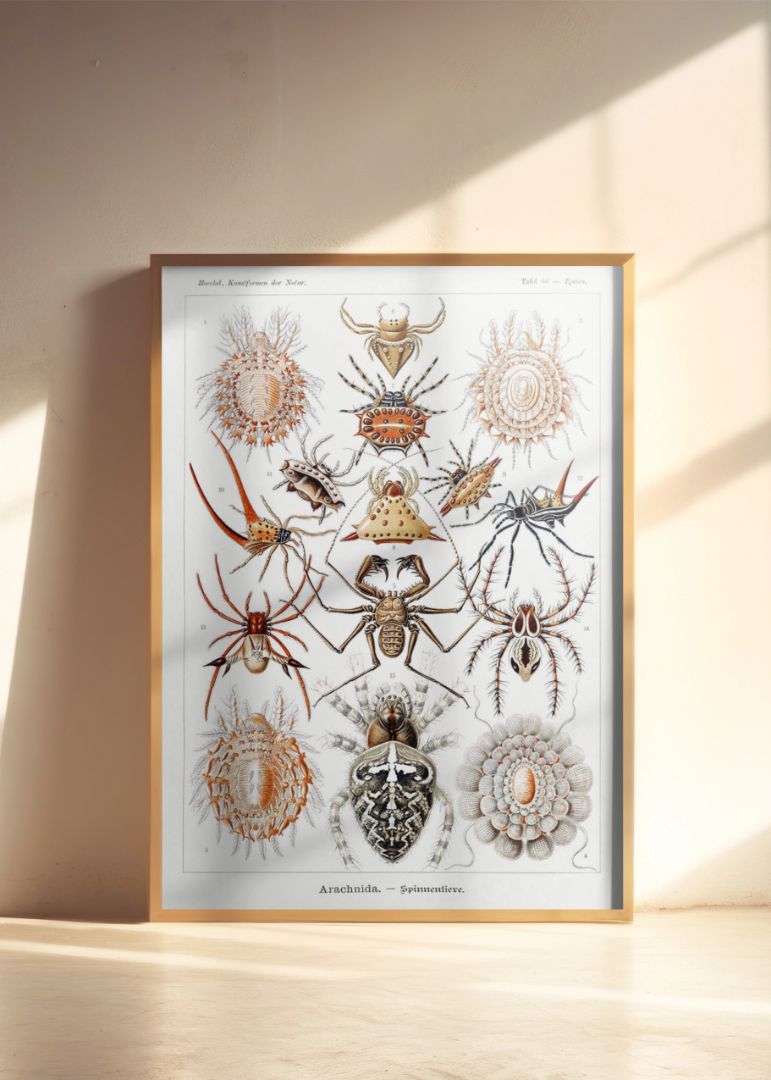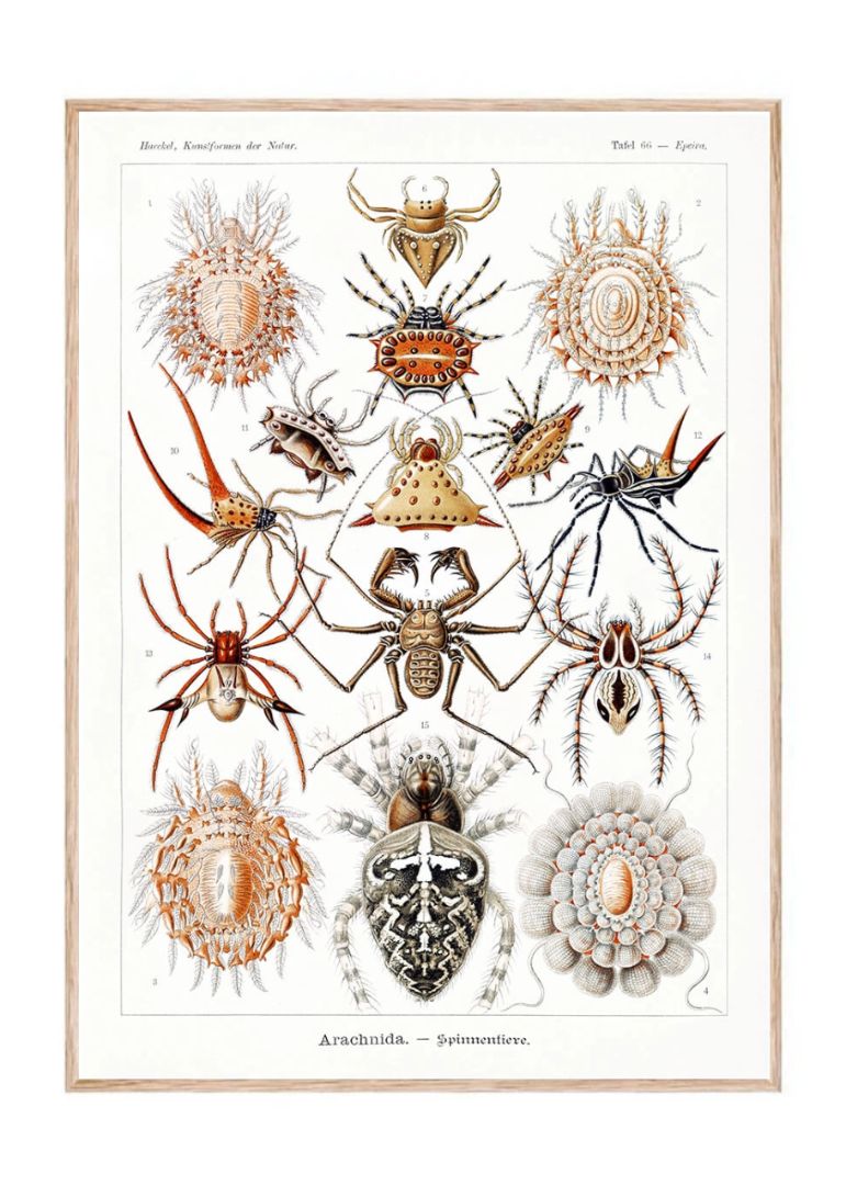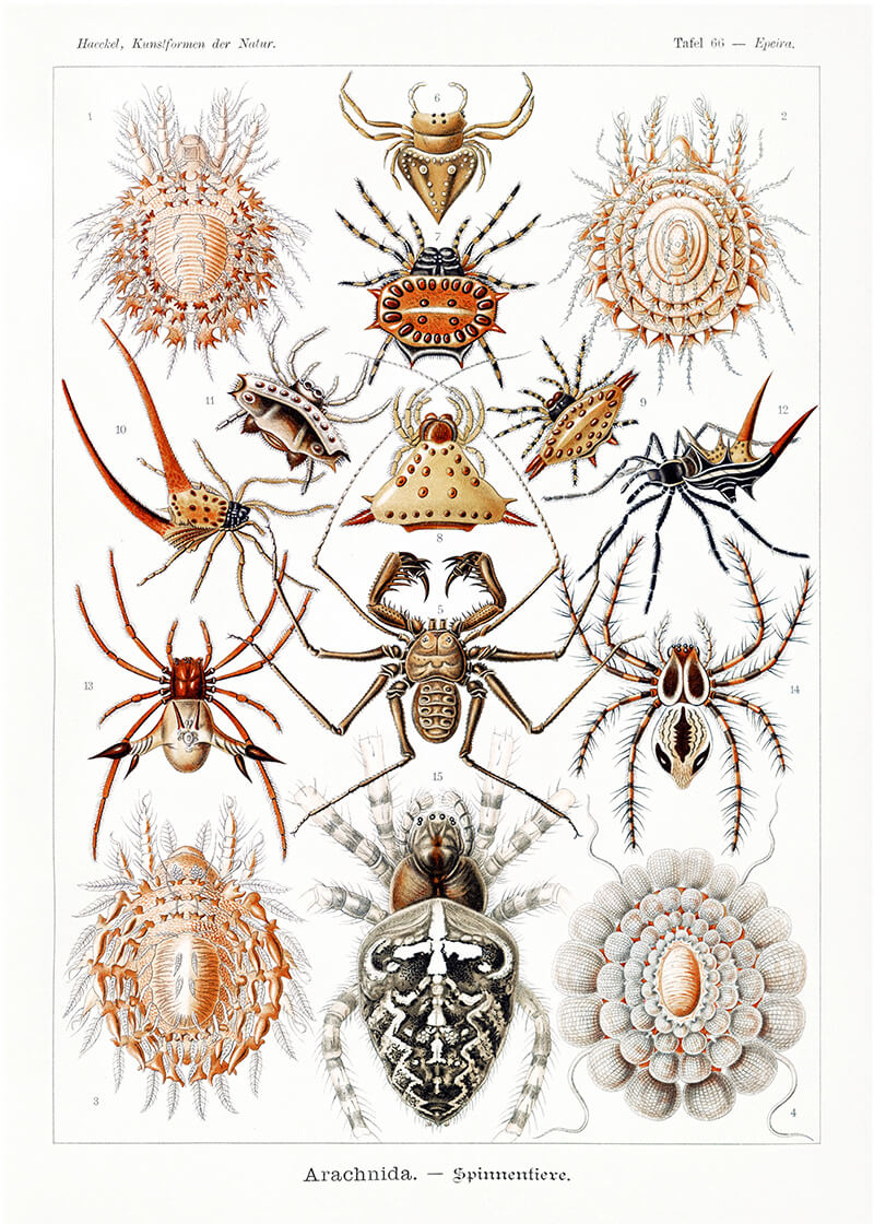 Fra de spidse ben til de udsmykkede kroppe af krabbe-edderkopper og jagtedderkopper demonstrerer Haeckel den utrolige variation og detaljerigdom i denne dyregruppe.