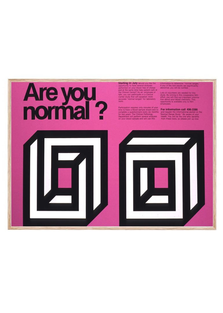 Denne plakat fanger øjet med sin stærke pink baggrund og skæve spørgsmål: "Are you normal?" Designet udfordrer beskueren til at tænke over, hvad normalitet egentlig betyder. Med geometriske former og optiske illusioner er denne plakat en visuel udfordring, der bringer både farver og filosofi ind i rummet. Et ideelt valg til dem, der elsker unikke og tankevækkende værker på væggene.