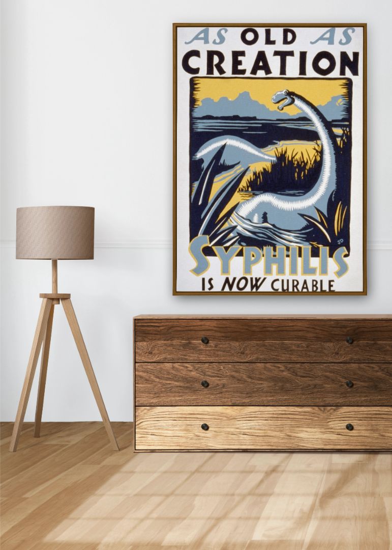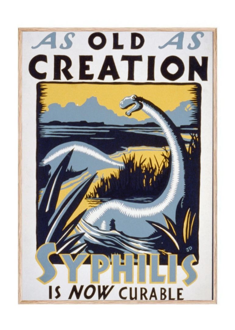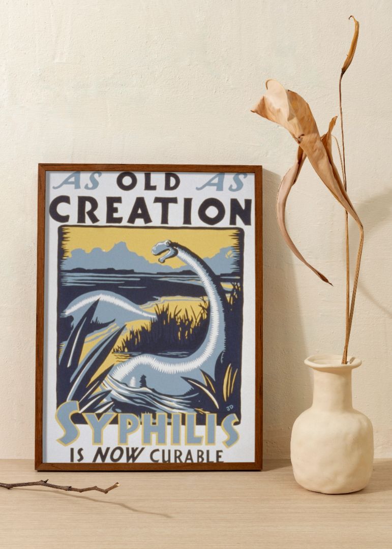 Denne plakat kombinerer dramatisk kunst med et vigtigt budskab, der står tidløst i sin relevans. Med sin illustration af en dinosaur i en sumpet scene vækker den både fascination og opmærksomhed. Budskabet om, at syfilis nu er helbredelig, står stærkt som en milepæl for medicinsk udvikling og oplysning.