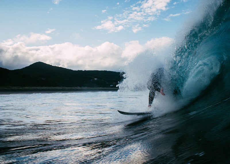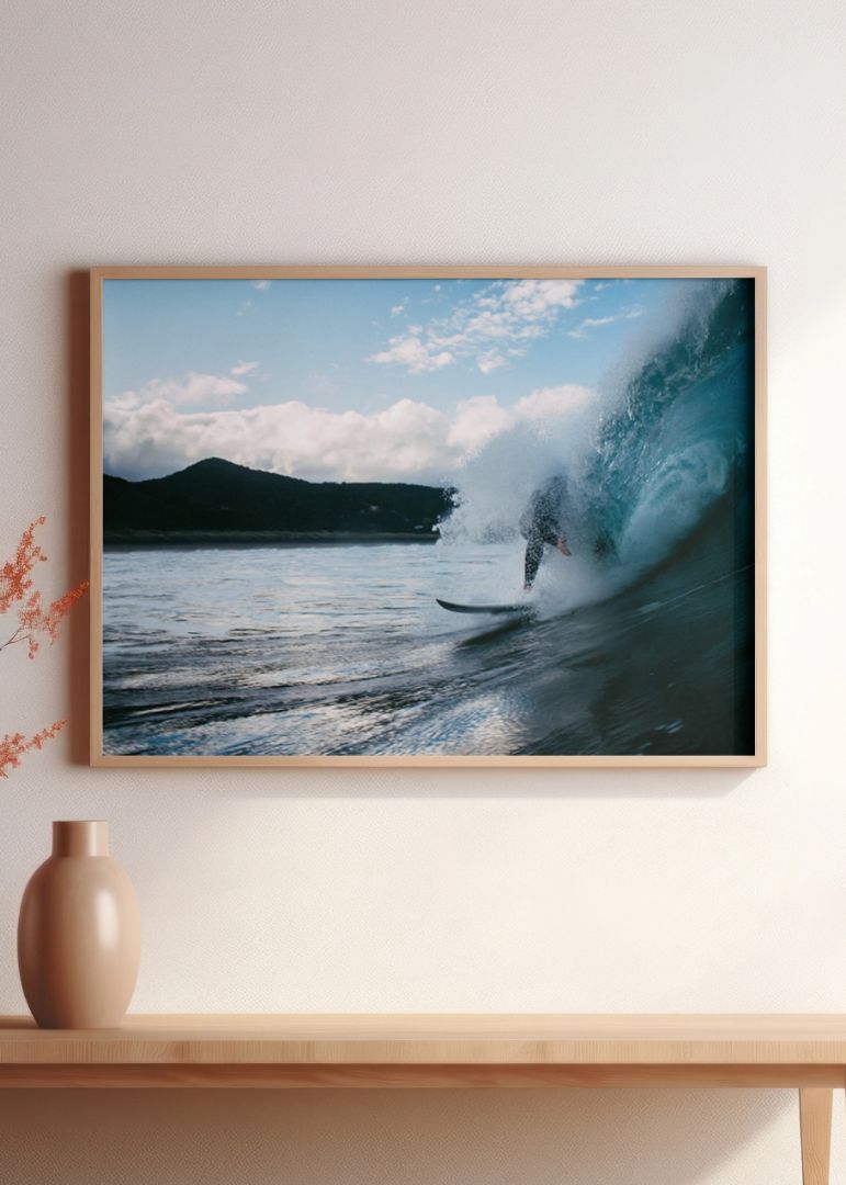 Motivet viser en surfer, der forsvinder ind i en bølge, mens havets kraft eksploderer omkring ham i et brus af skum og fart. Kameraets lave vinkel og det skarpe lys på vandets overflade gør scenen levende og næsten tredimensionel. Med bjerge i baggrunden og dramatiske skyer på himlen får du en intens og æstetisk stærk oplevelse lige på væggen.
