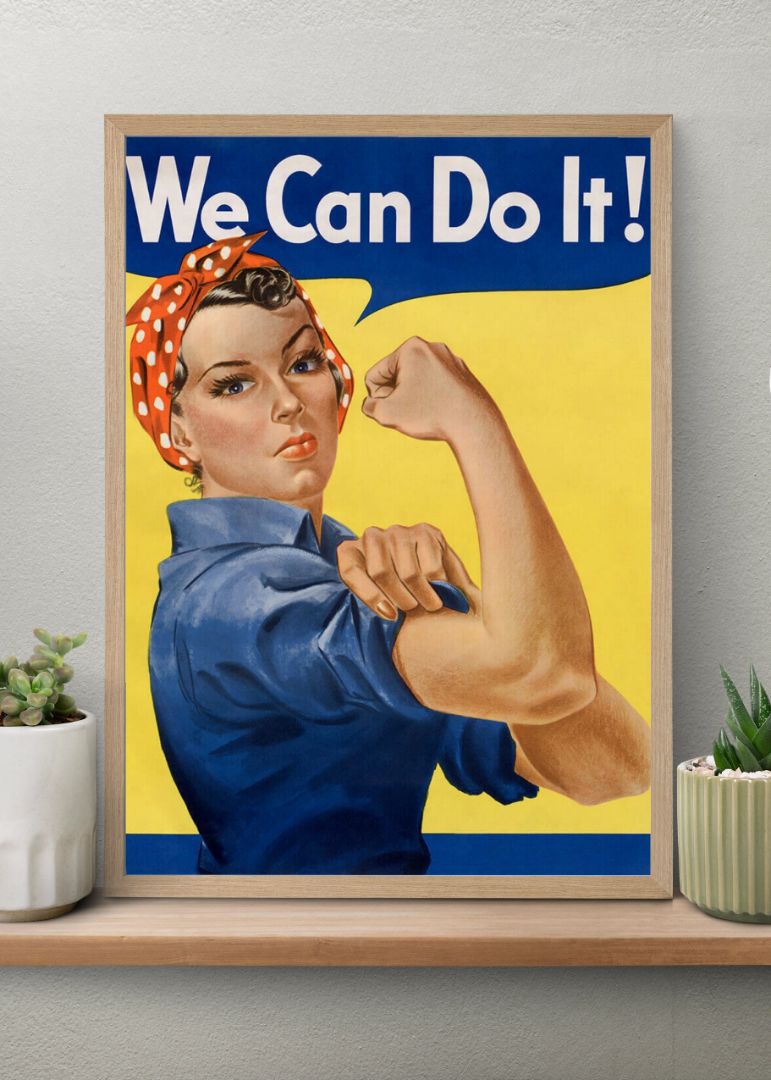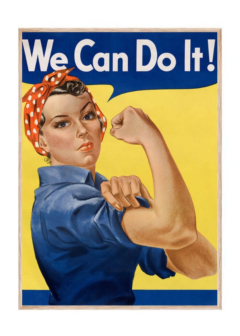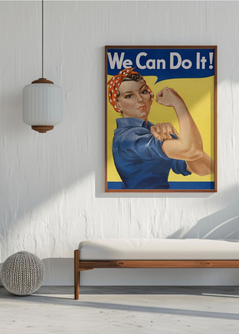 Fejr styrke og empowerment med We Can Do It!, en ikonisk plakat, der repræsenterer kvinders mod og udholdenhed. Den dristige kombination af gule og blå farver sammen med den selvsikre figur gør denne plakat til et kraftfuldt udsagn.