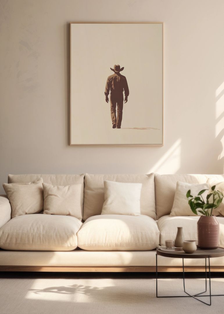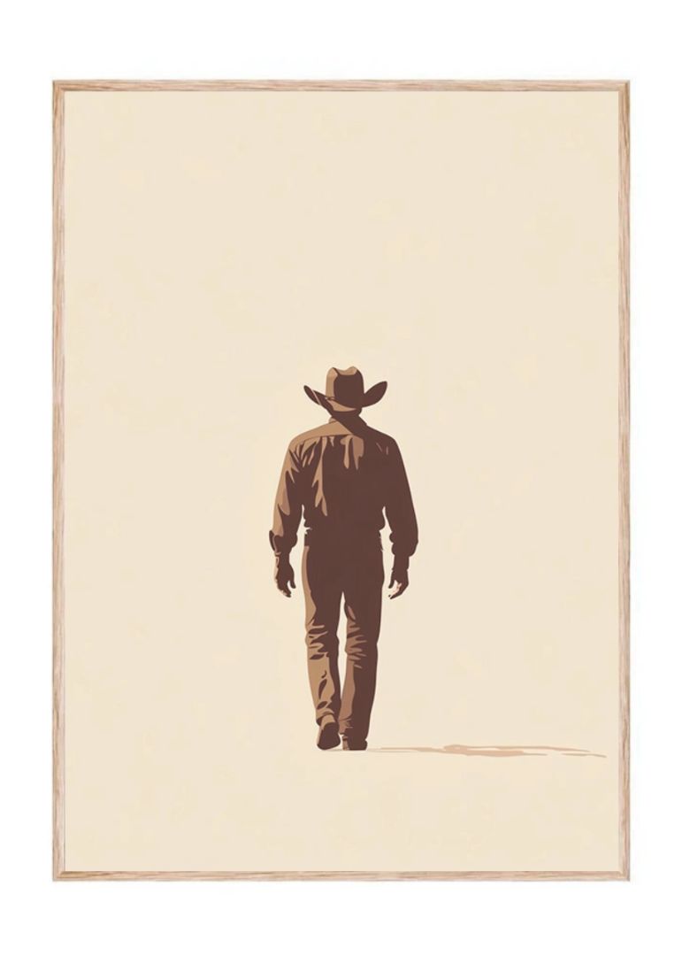 Plakaten viser en ensom cowboy i varme, jordnære toner, der vandrer mod horisonten med ryggen til. Det enkle, støvede baggrundsfarvespil og den stærke silhuet skaber et roligt, ikonisk udtryk, som emmer af både nostalgi og frihed. Her er intet overflødigt – kun figurens stærke tilstedeværelse i et åbent landskab.