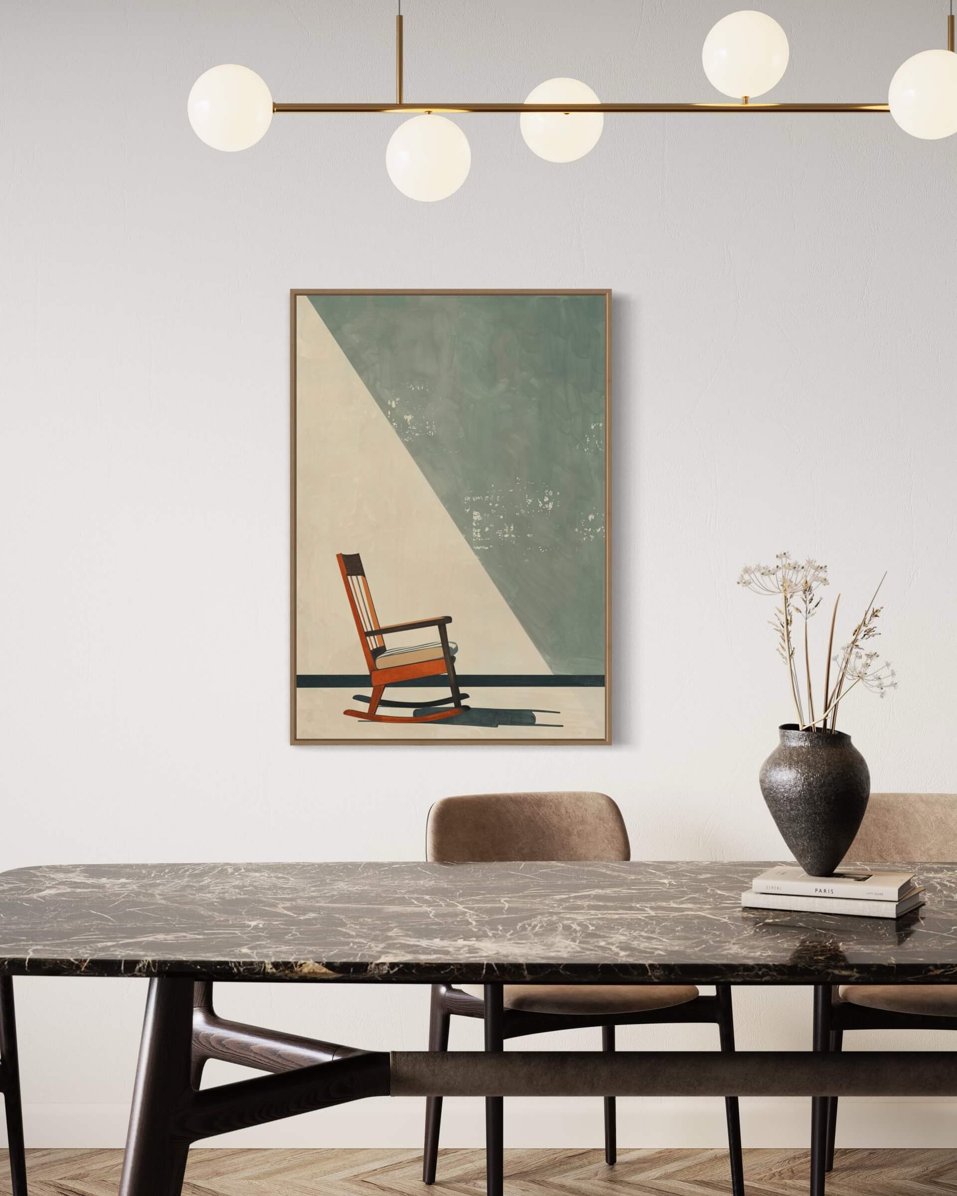 Denne smukke kunstplakat med et minimalistisk design fremhæver en klassisk gyngestol, der står alene i rummet, indrammet af en blød skygge. Plakaten fanger essensen af ro og eftertænksomhed, perfekt til at skabe en afslappet atmosfære i dit hjem eller kontor. Den subtile farvepalet gør, at plakaten passer ind i enhver indretning, mens gyngestolen symboliserer komfort og tid til refleksion. Denne plakat er ideel til dem, der værdsætter enkelthed, stil og et strejf af nostalgi.
