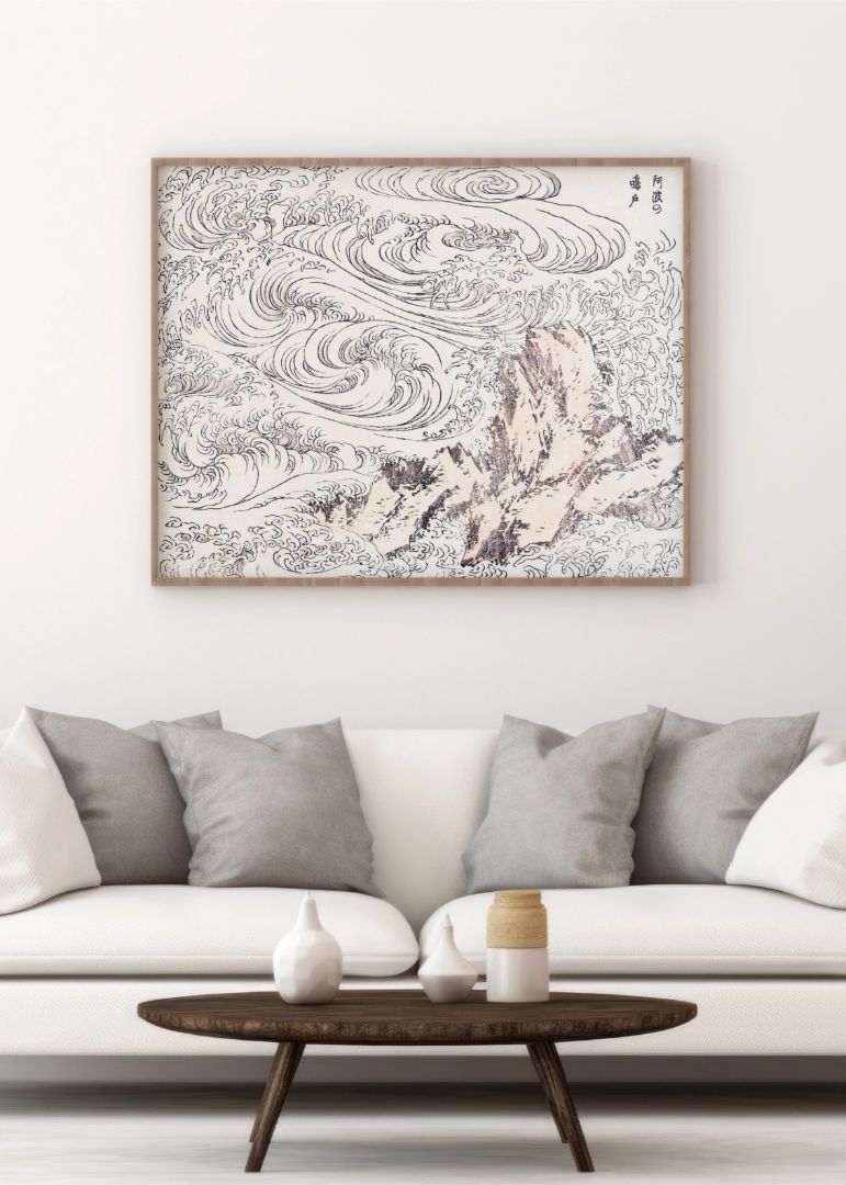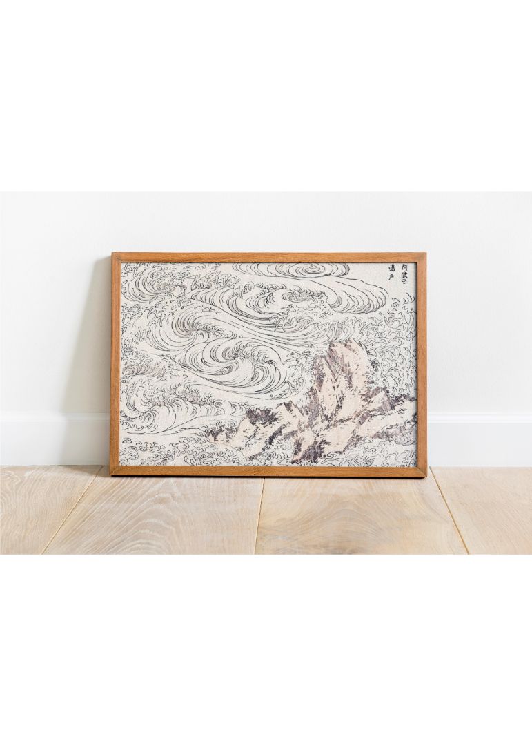 Dette energiske værk viser de dramatiske hvirvelstrømme ved Awa-kysten. De vilde bølger og de kraftige bevægelser skaber en følelse af styrke og naturens vildskab, som vil give ethvert rum et spændende visuelt udtryk. Hokusai formår at fange både kaos og skønhed i ét motiv.