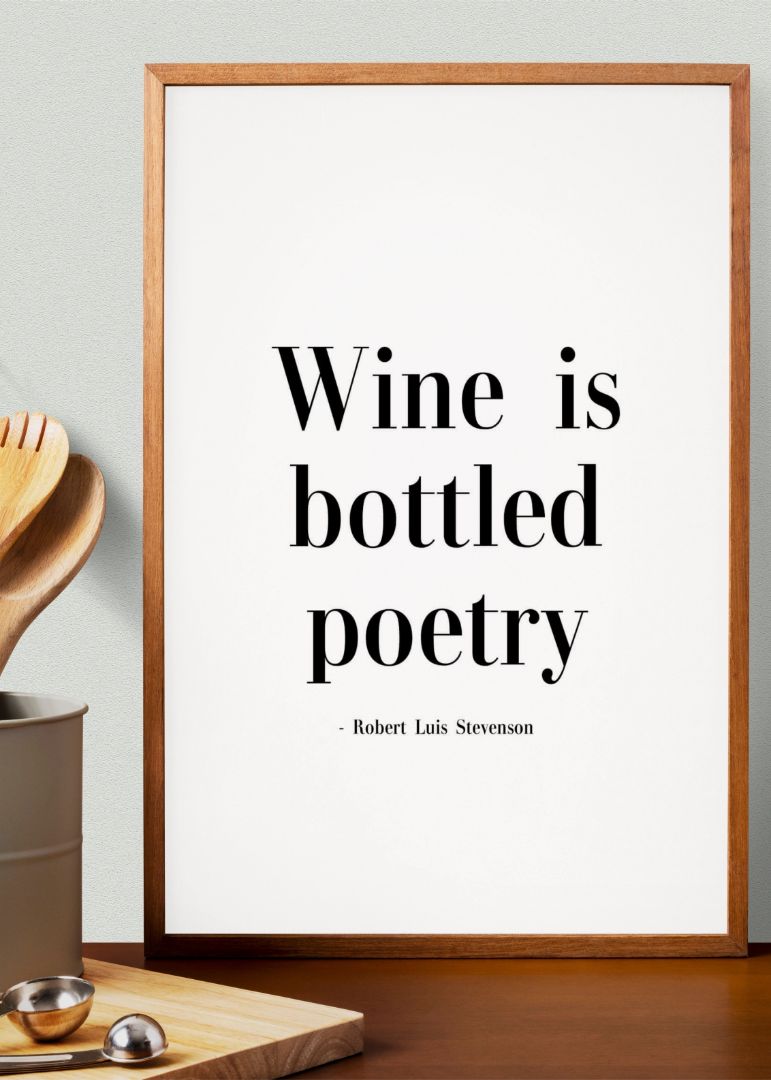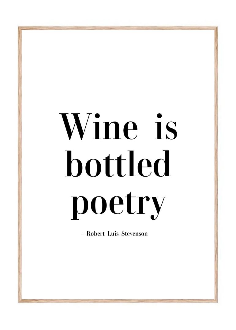 En elegant plakat til den sofistikerede vinelsker. Med sin enkle sorte tekst på hvid baggrund udstråler den klasse og raffinement, samtidig med at den hylder vinens poetiske væsen. Perfekt til dig, der ser vin som mere end bare en drik – men som en kunstform.