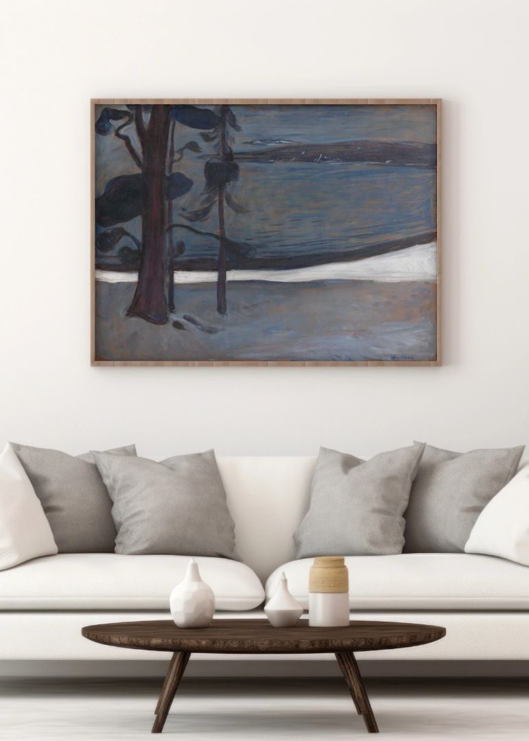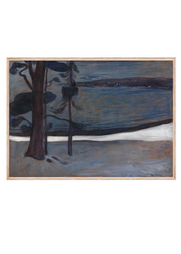 "Winter at Nordstrand" indfanger den stille, ensomme skønhed af en sneklædt kyst. Et dybt, mørkeblåt hav strækker sig langs horisonten, mens en dæmpet skovlinje i forgrunden skaber en følelse af dyb introspektion. De høje, mørke træer står som tavse vagter ved havet, og sneens lyse striber fremhæver vinterens kolde omfavnelse. Munchs farvepalet fremhæver en kølig ro, som trækker beskueren ind i et drømmende landskab fyldt med både stilhed og storhed.